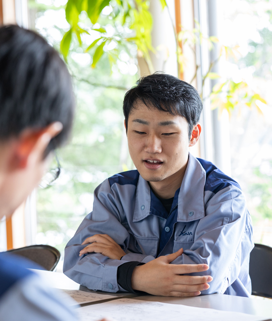 席も隣でよく⼀緒に仕事をしています。設計時には、⾒やすい図⾯の書き⽅や強度計算の⽅法、現場作業に適した構造の考え⽅などについて教えていただいています。